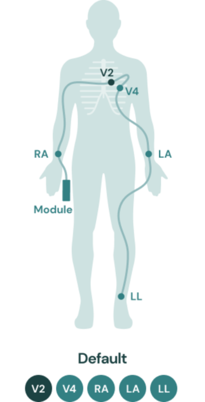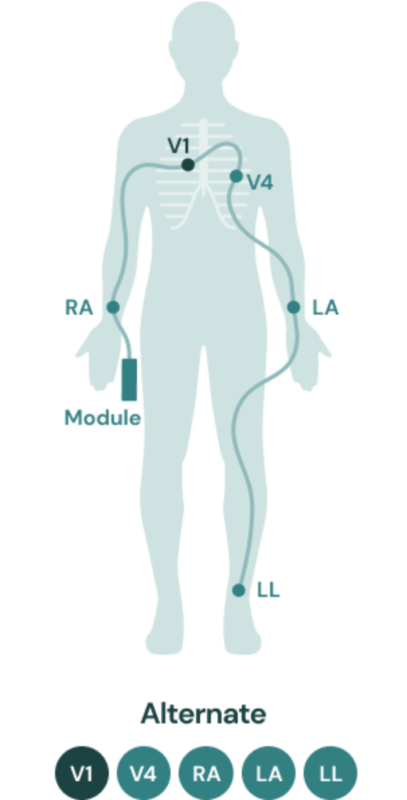Depending on patient symptoms, the KardiaStation App will recommend using Default placement (V2, V4, RA, LA, LL) or Alternate placement (V1, V4, RA, LA, LL)
